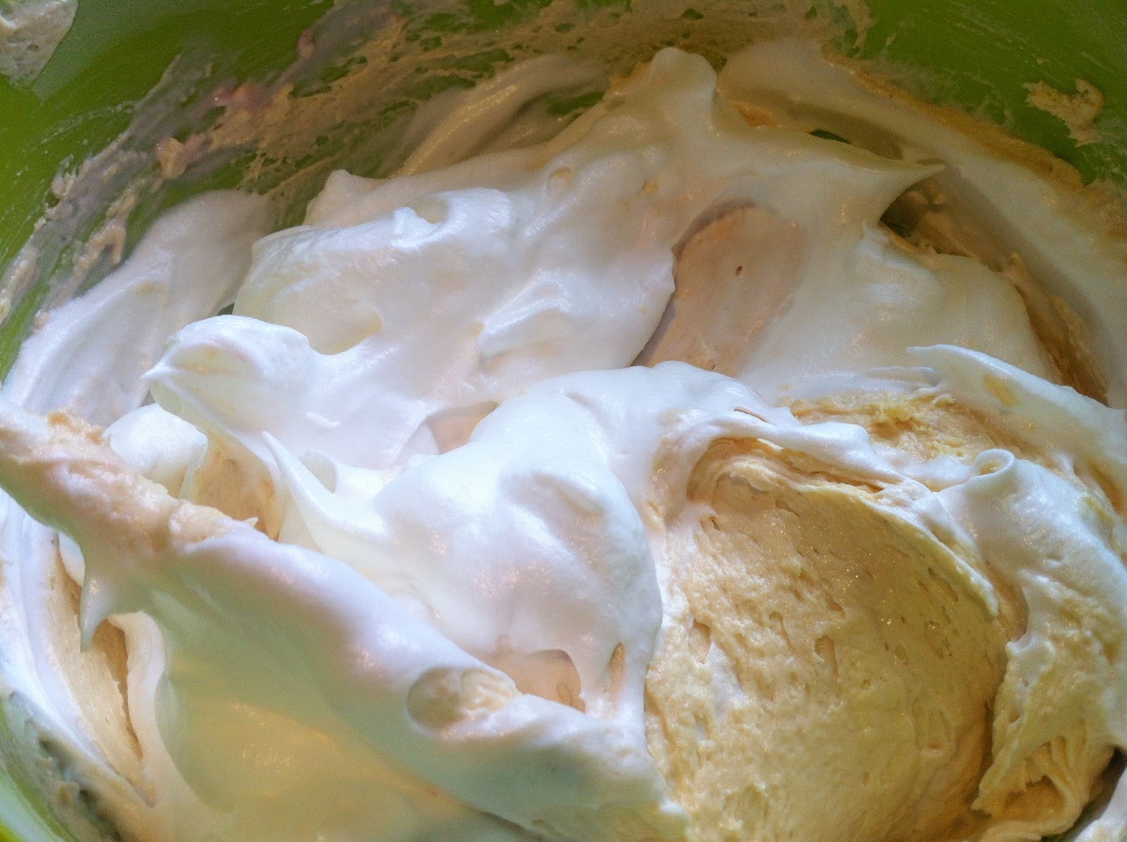 Now fold the egg whites into the cake batter mixture but do this gently so as not to knock out too much of the air. We need this to make the cake nice and light.