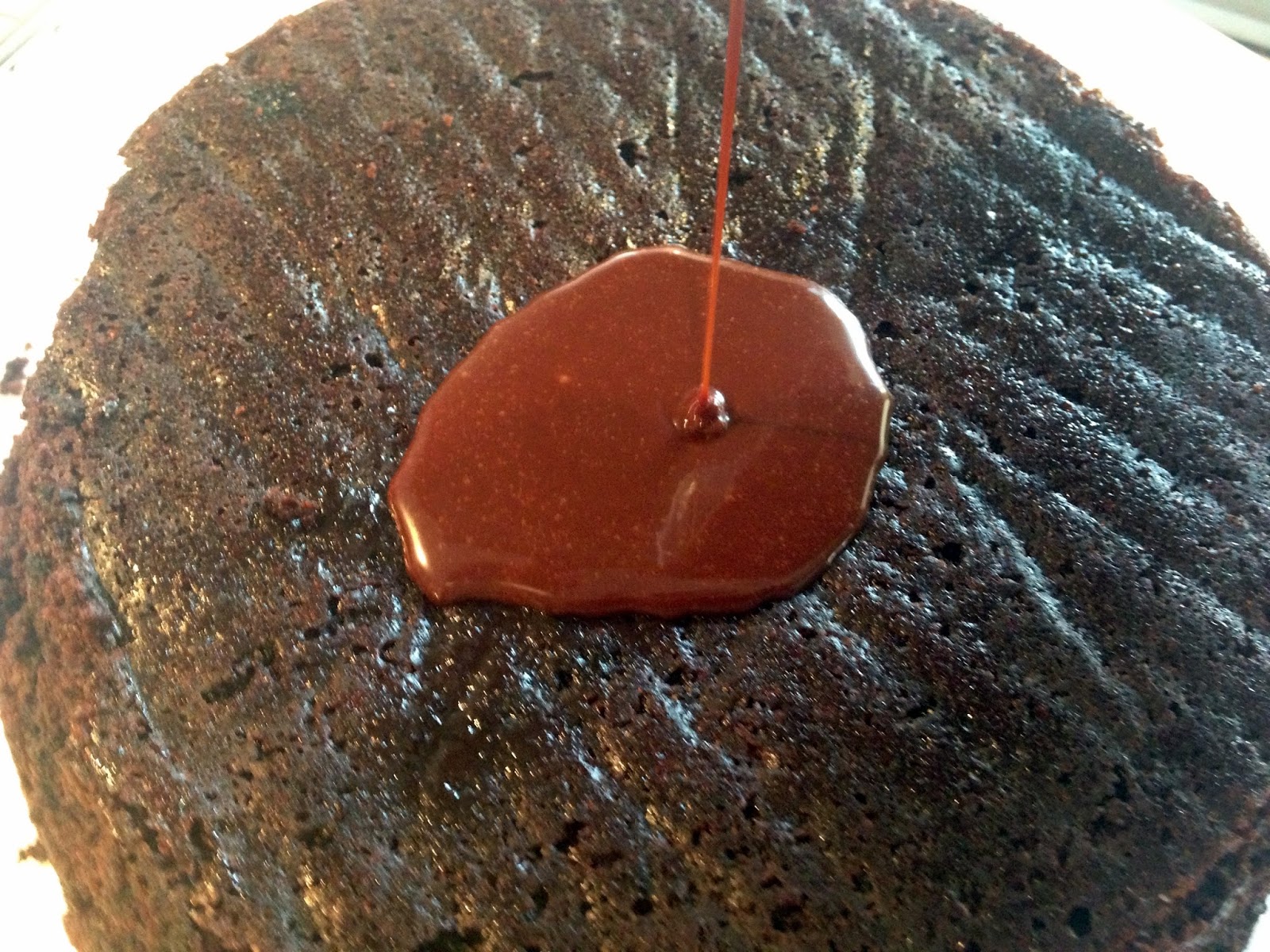 Pour the remaining chocolate glaze over the cake slowly allowing it to run down the sides and completely cover the cake. Spoon some of the glaze over the sides to ensure everything is covered.