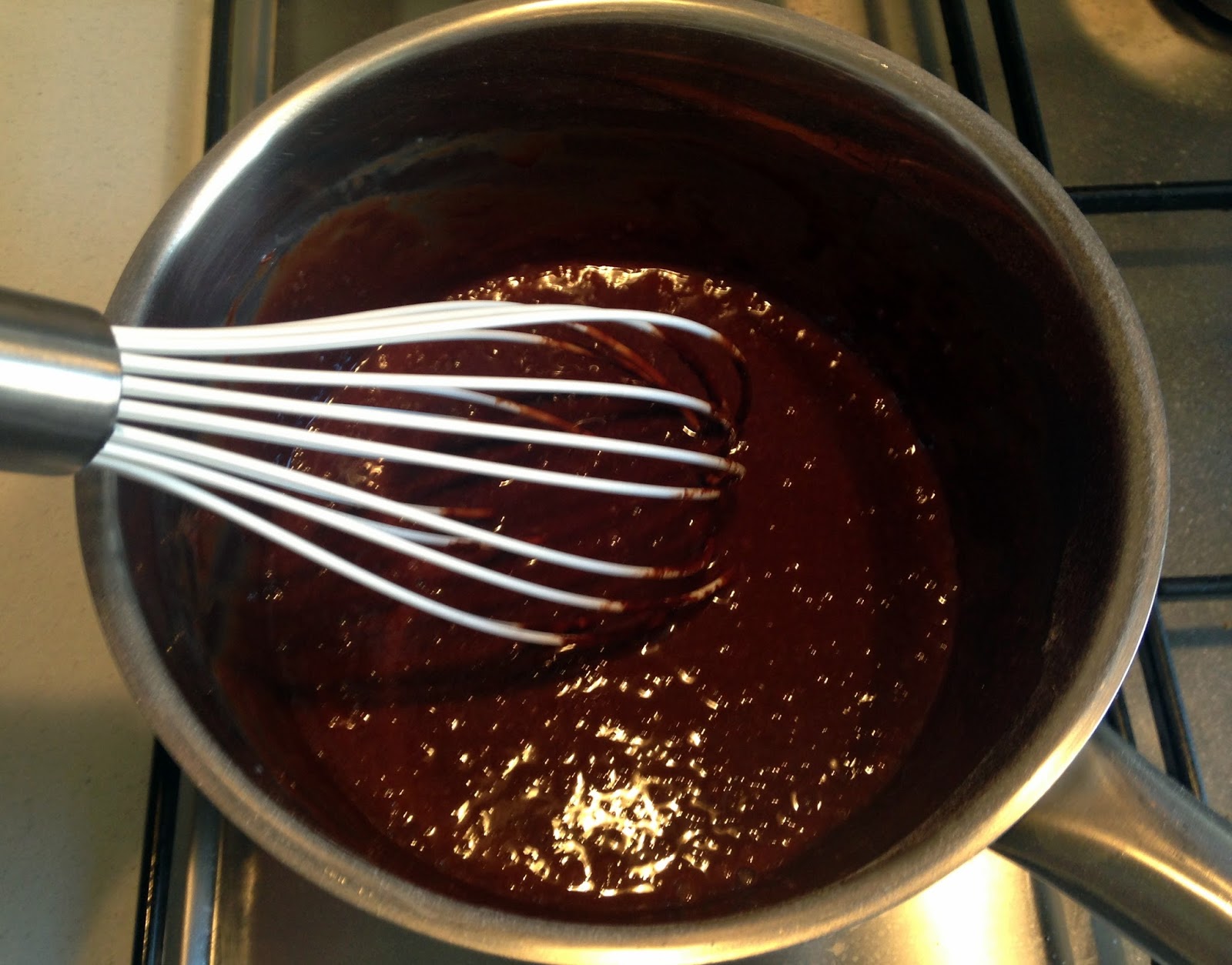 I find it best to pour this chocolate glaze into a jug, it makes covering the cake later a lot easier.